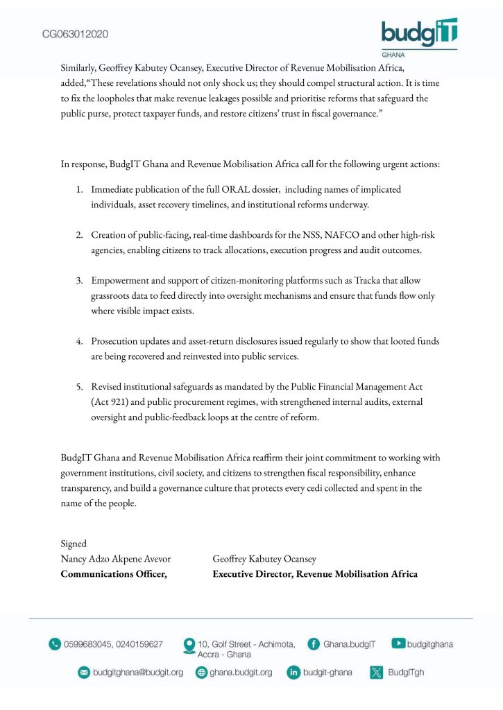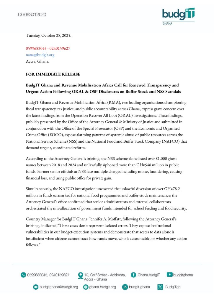 BudgIT Ghana and Revenue Mobilisation Africa (RMA), two leading organisations championing fiscal transparency, tax justice, and public accountability across Ghana, express grave concern over the latest findings from the Operation Recover All Loot (ORAL) investigations. These findings, publicly presented by the Office of the Attorney General & Ministry of Justice and submitted in conjunction with the Office of the Special Prosecutor (OSP) and the Economic and Organised Crime Office (EOCO), expose alarming patterns of systemic abuse of public resources across the National Service Scheme (NSS) and the National Food and Buffer Stock Company (NAFCO) that demand urgent, coordinated reform.